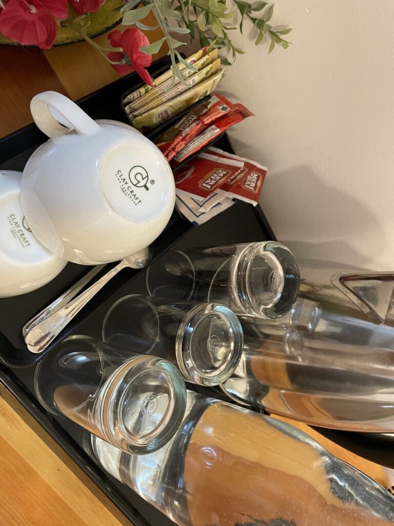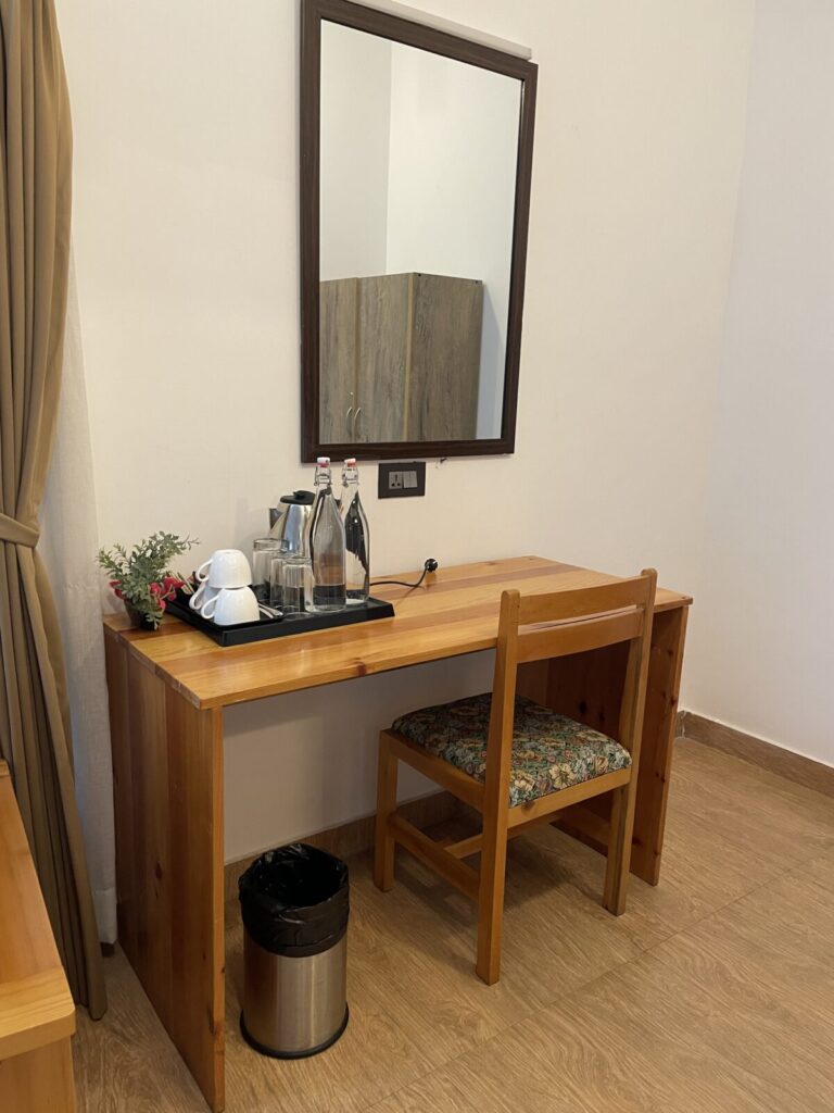 お部屋は、シンプルな作りですが、ファブリックの柄がかわいかったです。化粧台やミニバー(ティー、コーヒー、ケトルなど)もありました。