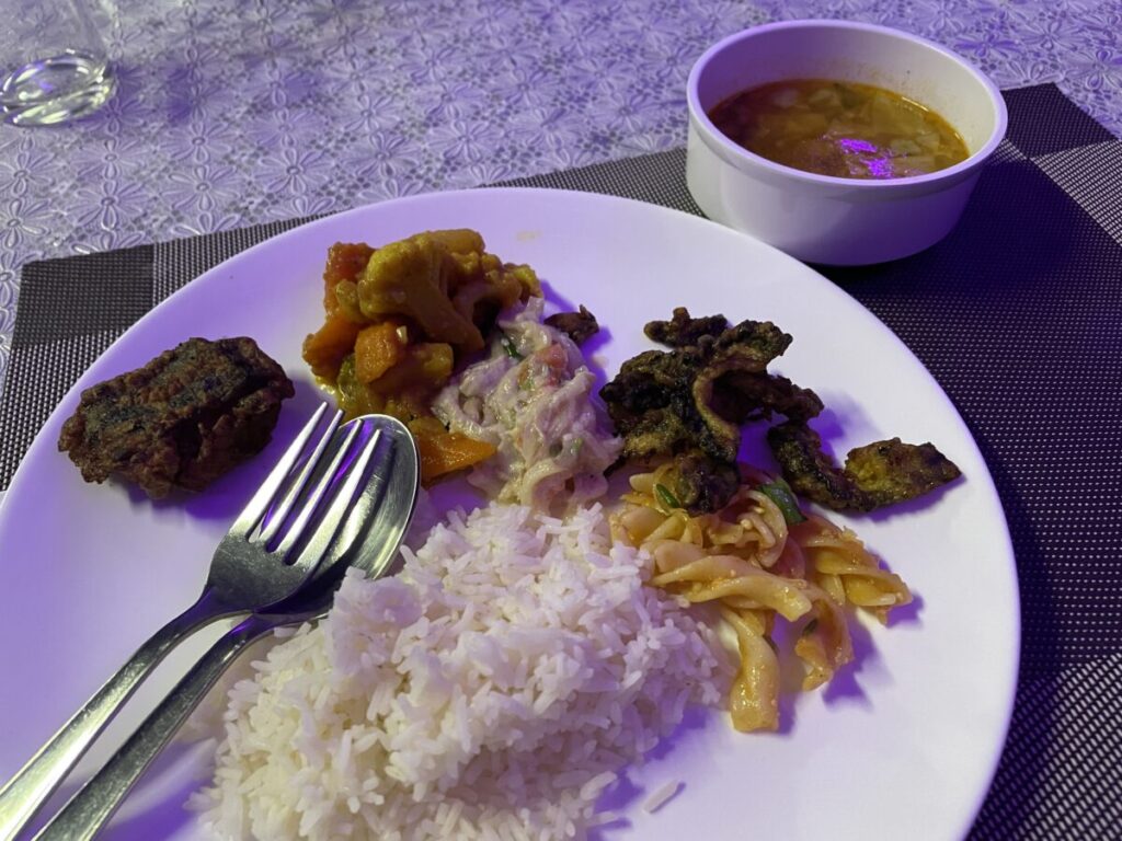 一応インターナショナル料理ですが、インド系のお料理が多かったと思います。徒歩10〜15分圏内でごはん屋さんなどはなかったのと、夜は結構暗い&冷えるので、ずっとホテルに滞在していました。(また、ホテルでの食事は全てツアー代金に含まれていました!)