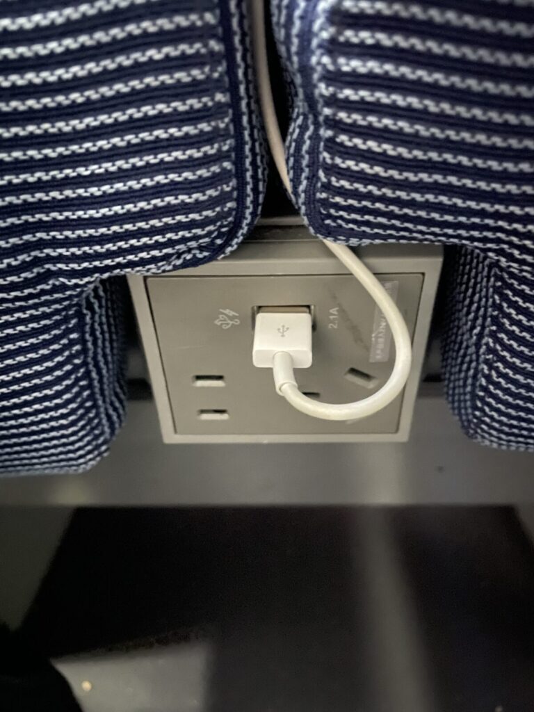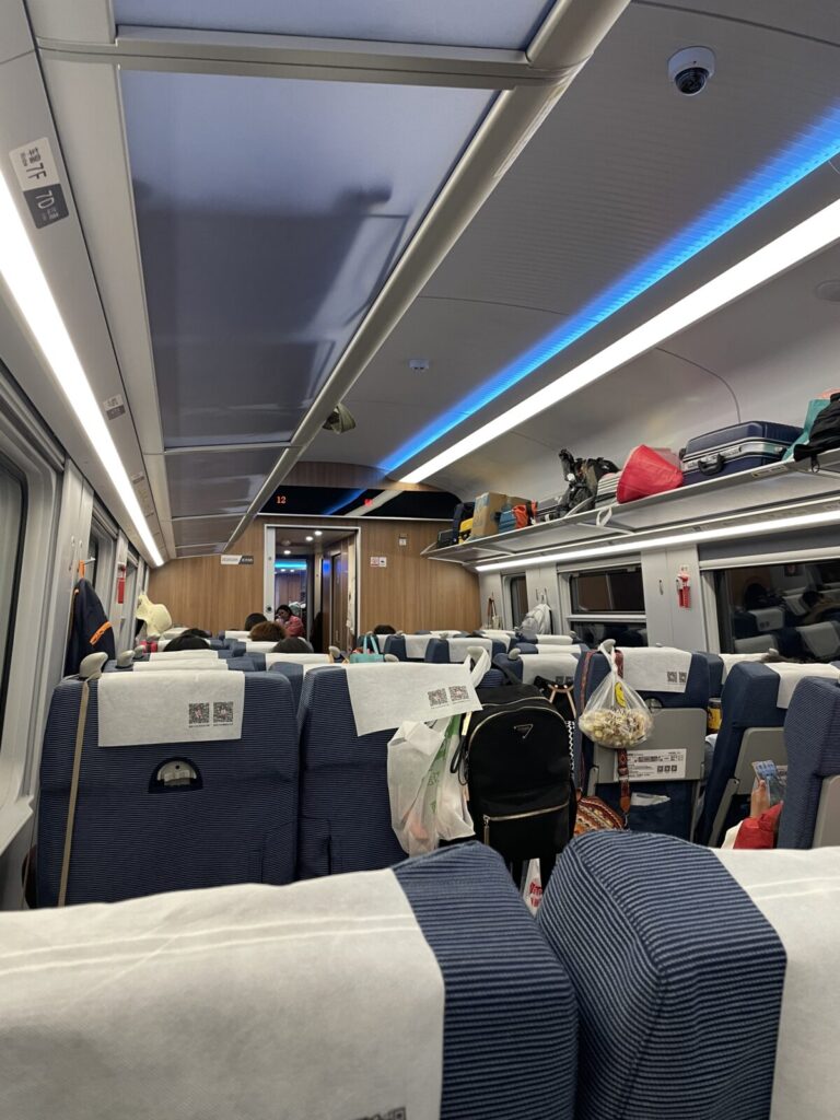2等座席はこんな感じ。座席の下にはコンセントあり。早めに乗らないと上の荷物棚がいっぱいになってしまうかもしれません。