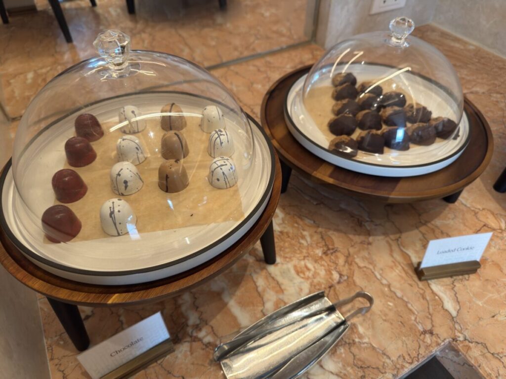 こちらは、ブッフェ形式でした。数種類のケーキ、チョコレートボンボン、フルーツ、クッキーなどが並びます。