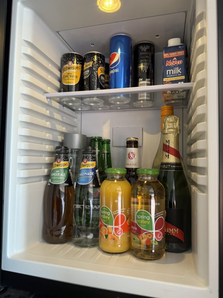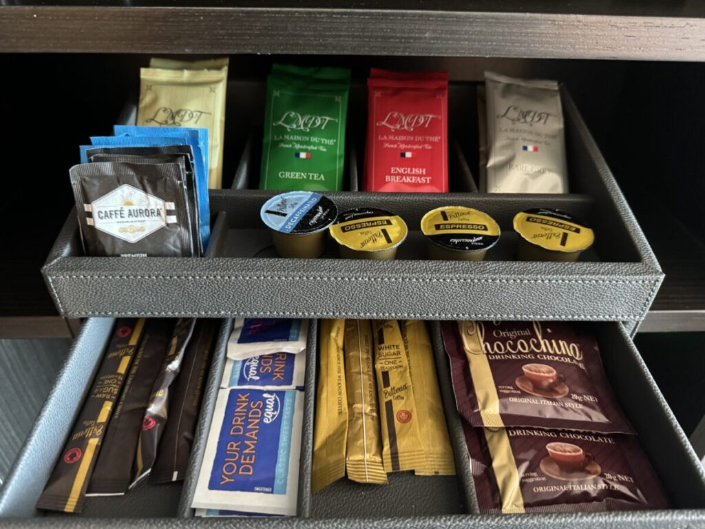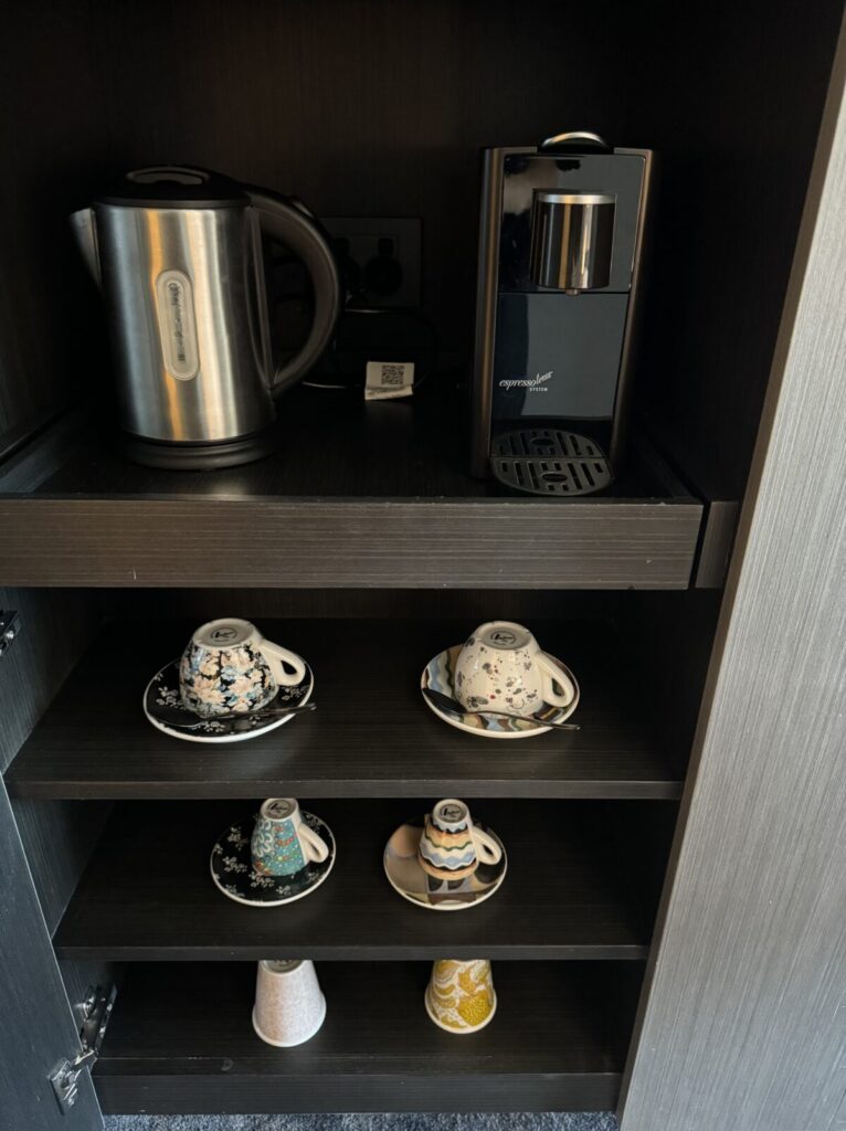 ミニバーはこんな感じ。コンプリメンタリーティー・コーヒーの他、チョコレートも置いてありました。