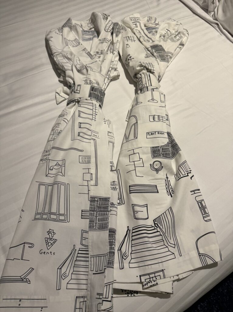 これまた広い!カーブになっていておしゃれです。スリッパとバスローブはこんな柄でテンション上がります!