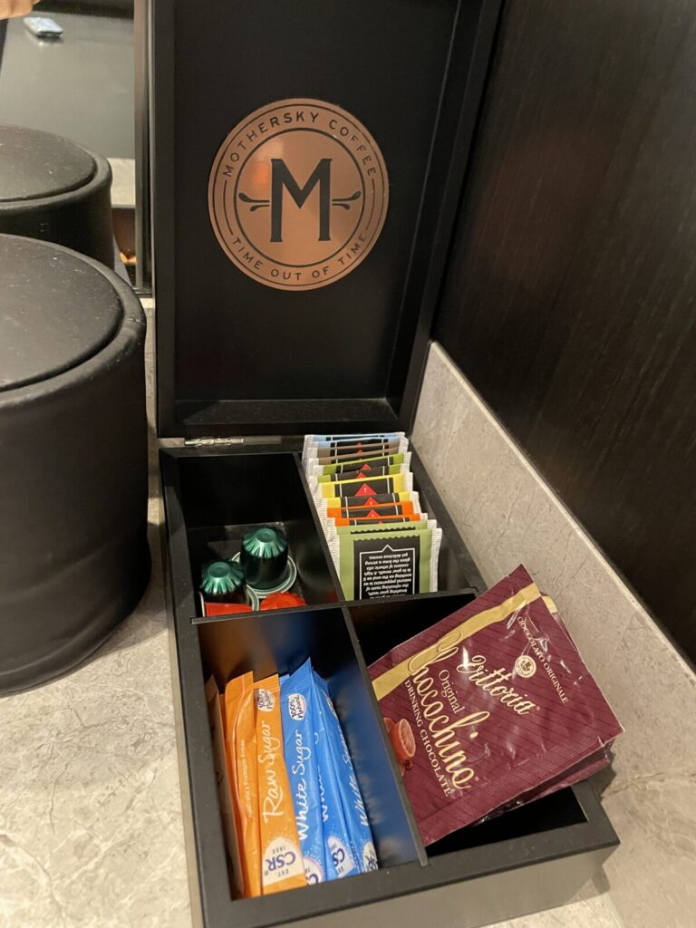 ミニバーには、コンプリメンタリーティーのほか、チョコレートドリンクも置いてありました。ポイント高いです!