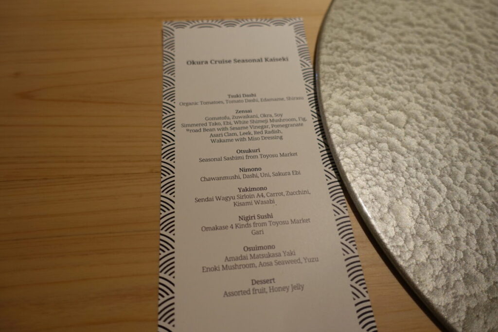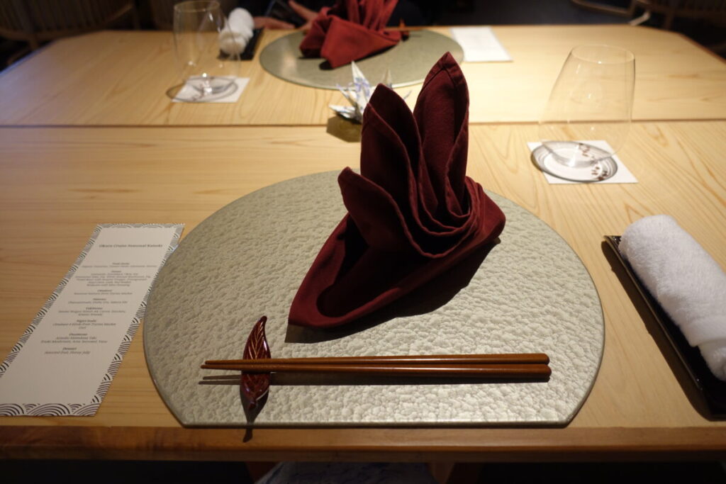 オークラマークが入っている方が、鉄板焼きメニューのお客さん向け、この写真の向かって右側(進行方向)が懐石メニュー向けのお客さん向けの席でした。