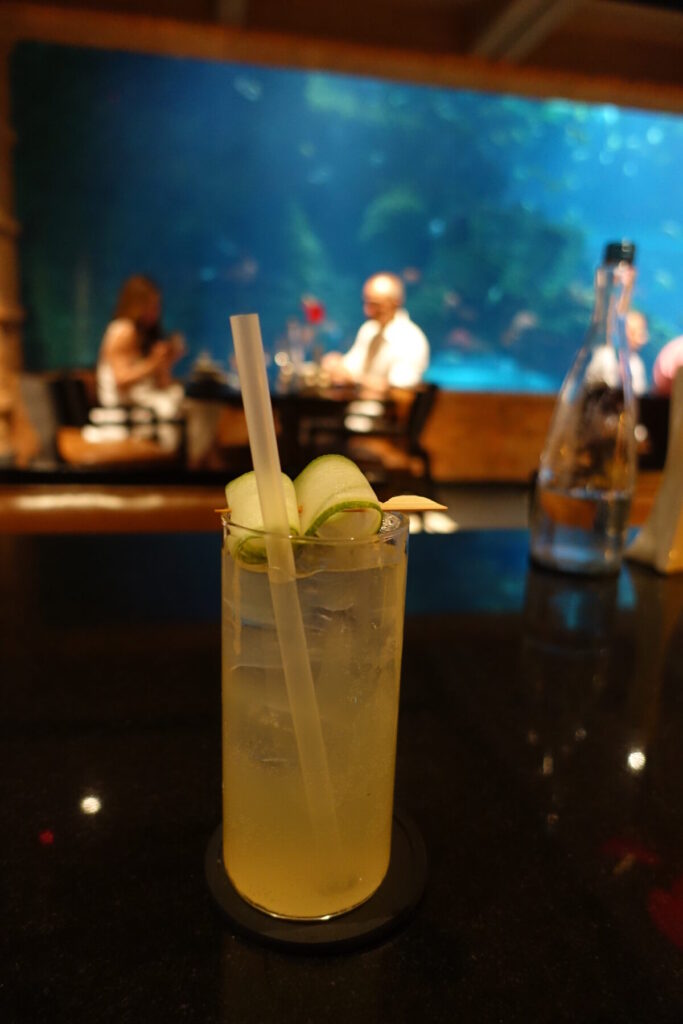 まず、ドリンクはモクテルを注文してみたのですが、こちらは甘い&きゅうりみ強めで、まあまあでした。笑