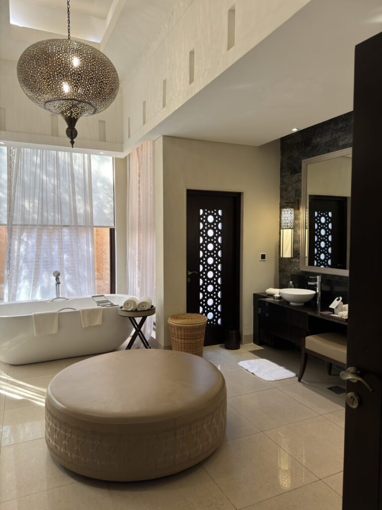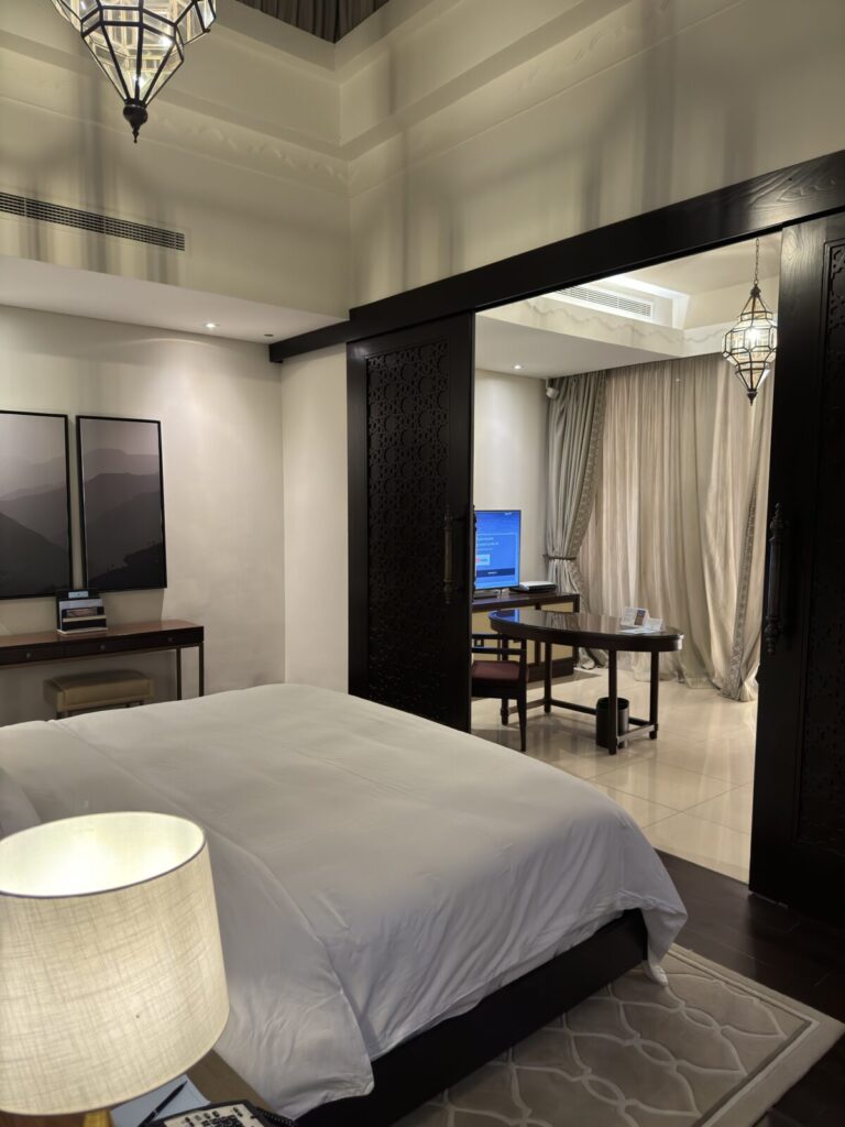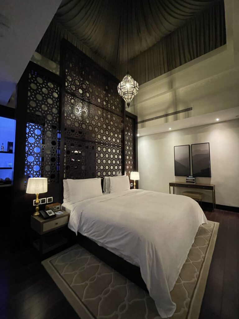 でっかいキングベッド(通常のキングベッドよりでかい?)が中央にあり、まあまあスタンダードなベッドルームかと思いきや、高ーい天井とアラベスク調の内装がとっても素敵でした。全然スタンダードじゃなかった。笑