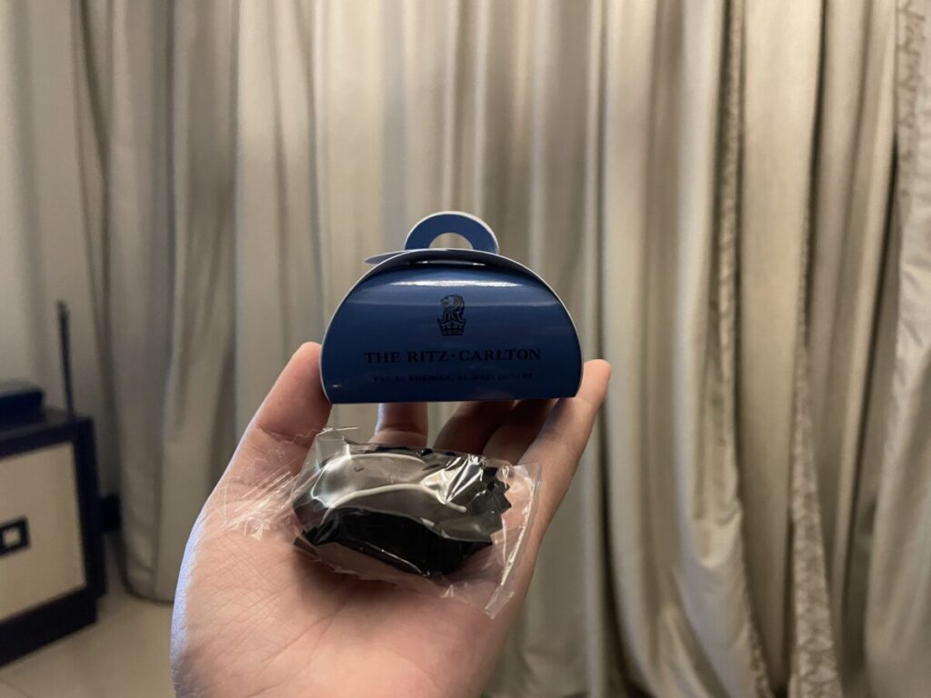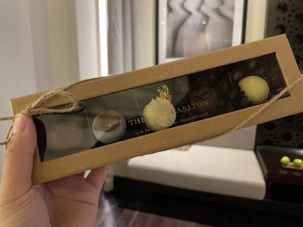 ウェルカムアメニティで、チョコレートが置いてありました。ターンダウン後にはチョコレートデーツも♡