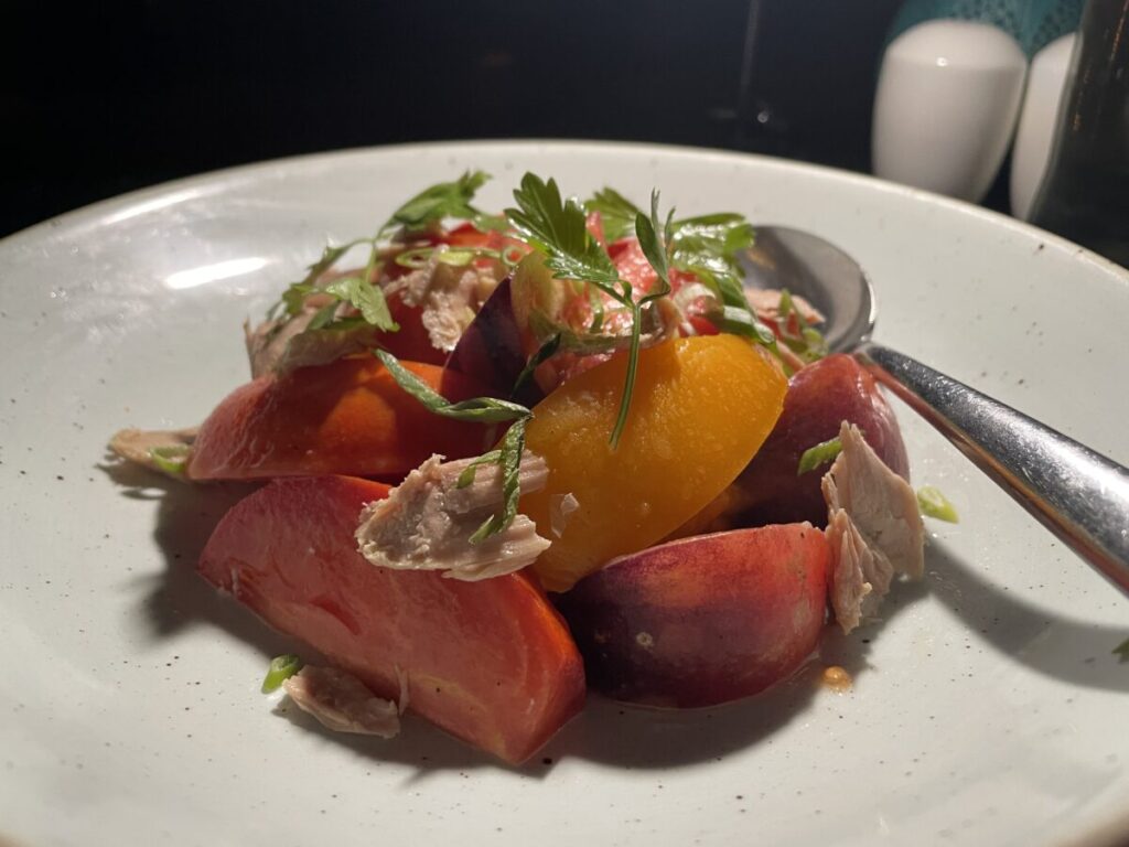 頂いたごはんはこちら。トマトとツナのサラダ、エビのグリル、デザート。トマトがすごい立派で美味しかったなあ。